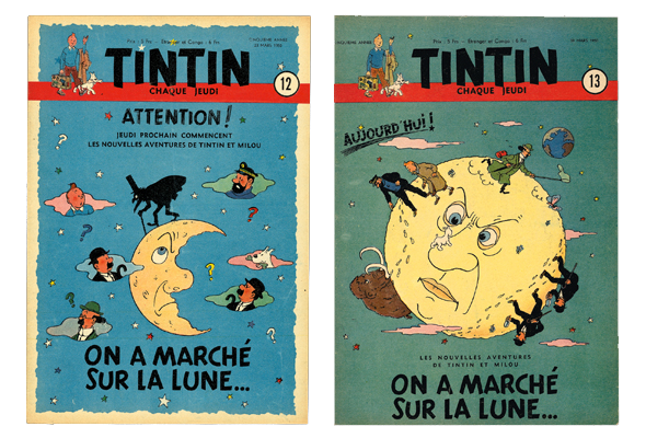 Hergé anunció la próxima historia con dos portadas consecutivas de la revista Tintin cada una representando la Luna. La historia comenzó la serialización en la revista belga Tintin del 30 de marzo de 1950, en lengua francesa. Comenzó entonces la serialización sobre la frontera con Francia, en la edición de la revista de ese país, a partir del 11 de mayo de 1950. Durante este tiempo, hubo cambios en la forma en que Hergé condujo su trabajo; el 6 de abril de 1950, creó los estudios Hergé como compañía pública. Los estudios se basaron en su casa de la avenida Delleur en Bruselas, ya que Hergé había adquirido una casa de campo en Céroux-Mousty, que se convirtió en el domicilio principal de él y su esposa Germaine. Los estudios prestarían tanto apoyo personal a Hergé como apoyo técnico para su trabajo en curso. Contrató a Bob de Moor como su aprendiz primario en los estudios en marzo de 1951.