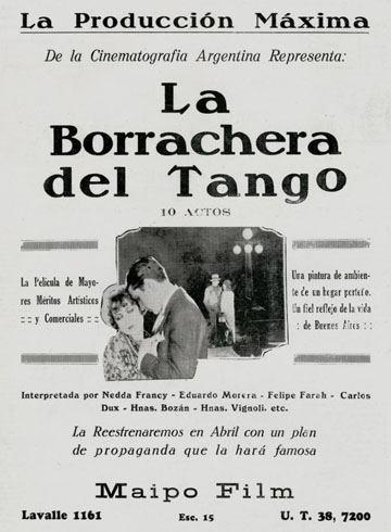 Título original La borrachera del tango | Año 1928 | Duración 80 min. | País Argentina | Dirección Edmo Cominetti | Guion Elías Alippi, Carlos Schaefer Gallo | Reparto Carlos Dux, Felipe Farah, Nedda Francy, Eduardo Morera | Fotografía Alberto Biasotti | Género Drama.