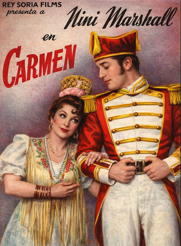 Título original Carmen | Año 1943 | Duración 96 min. | País Argentina | Dirección Luis César Amadori | Guion Luis César Amadori, Tito Insausti, Arnaldo Malfatti, Henri Meilhac. Novela: Prosper Mérimée | Reparto Niní Marshall, Juan José Padilla, Adrián Cuneo, Juan José Piñeiro | Música Mario Maurano | Fotografía Alberto Etchebehere (B&W) | Género Comedia. Musical. Sátira.